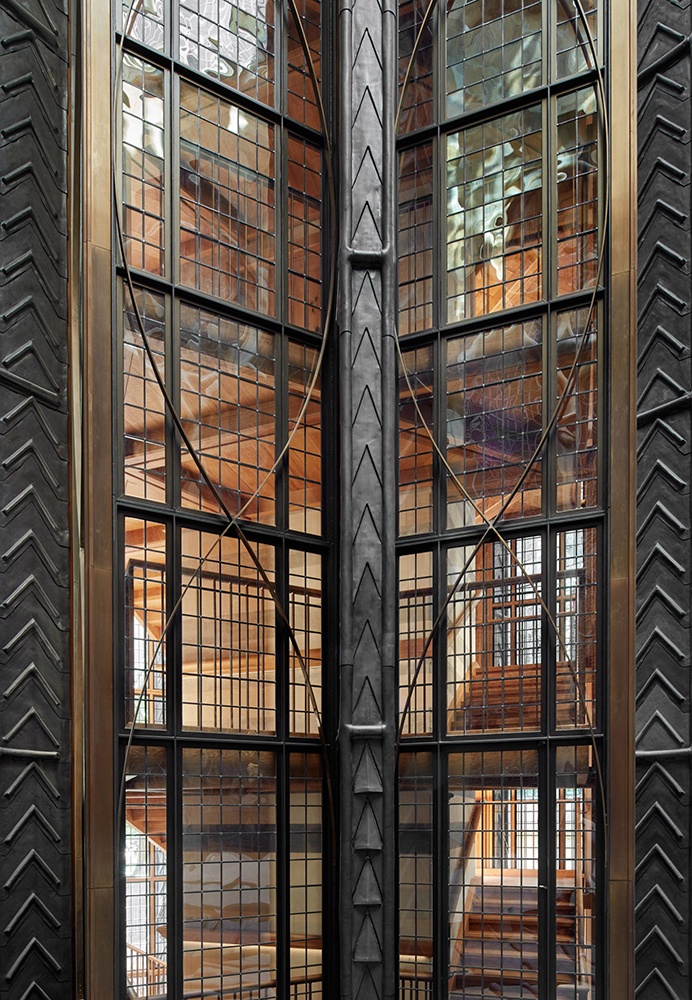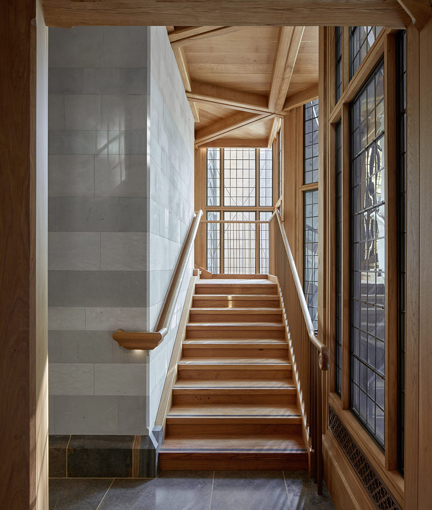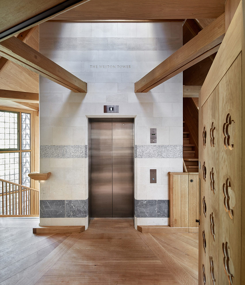 La torre de marco de acero se compone de dos volúmenes cuadrados apilados, uno de los cuales se ha girado en un ángulo de 45 grados para crear una placa de piso en forma de estrella. En la cima de la nueva adición se encuentra una corona de acero. En el centro de la torre hay un ascensor, diseñado para visitantes con alguna discapacidad y sus cuidadores. Alrededor hay una escalera de roble, iluminada por paneles de acristalamiento. Los espacios de exposición fueron diseñados por MUMA. Donde se exhibirán más de 300 obras de arte del pasado de la Abadía.